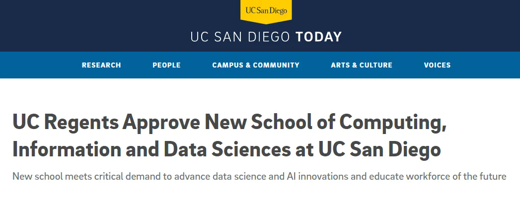 就在当地时间7月18日,加州大学圣地亚哥分校(UCSD)宣布将成立一个新学院——计算、信息和数据科学学院School of Computing, Information and Data Science(SCIDS)。