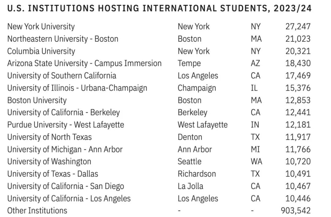 报告显示2022/23学年,纽约大学依旧是国际学生的最爱,国际生人数有27,247人。其次是东北大学波士顿校区、哥伦比亚大学、亚利桑那州立大学、南加州大学、伊利诺伊大学香槟分校、波士顿大学、加州大学伯克利分校、普渡大学西拉法叶主校区、北得克萨斯大学。