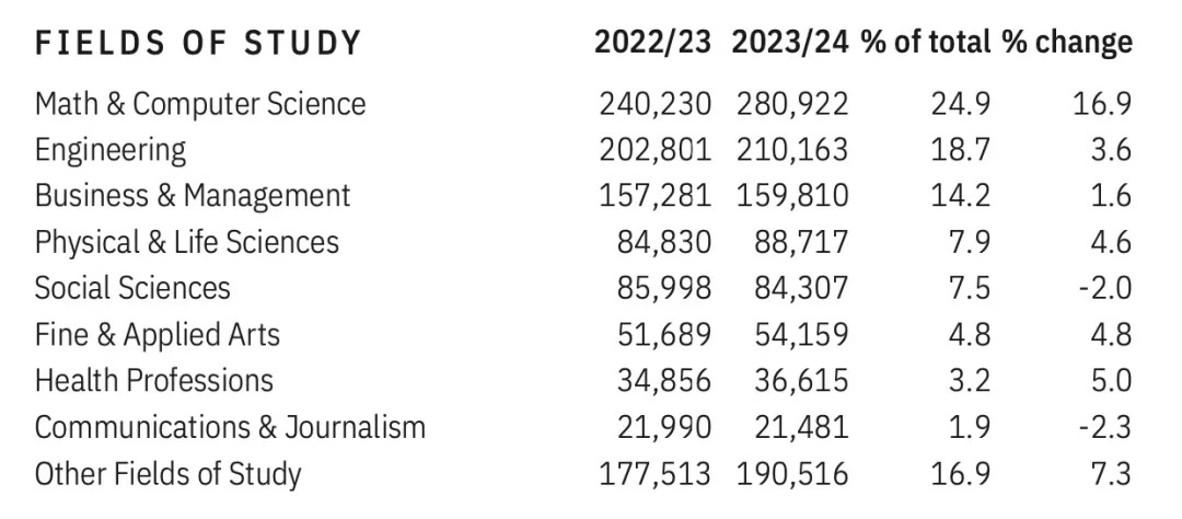 留学生的专业选择数据,也是每年大家非常关注的内容,该数据的变化也代表着目前美国专业的趋势,同时也在一定程度上映射着目前的“留美就业形势”。
