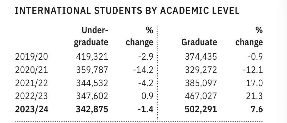 从国际学生群体来看,2023/24学年,就读美国大学本科学位的学生有342,875名,有小幅度的下降;就读研究生学位的人数为502,291名,较去年有上涨,达7.6%。由此看出选择赴美读研的国际生越来越多!