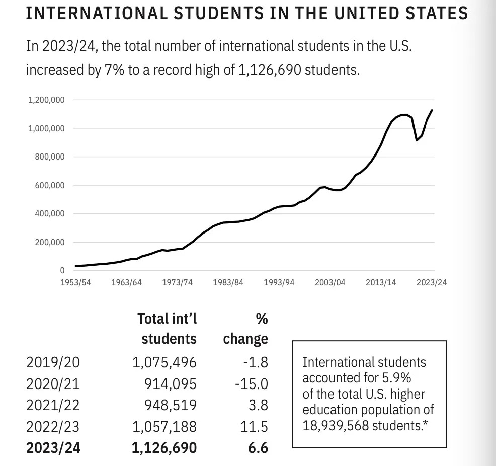 根据报告显示,就读美国各类学校的留学总人数再次破百万。2023/24学年,共有1,126,690名来自世界各地的留学生在美国各类大学就读,与去年相比增加6.6%,这也是距2019/20年后,连续第三年的增长。