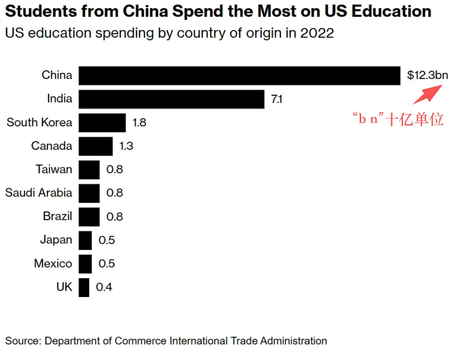 国家经济层面,美国商务部数据显示,国际学生在 2022 年对美国经济的贡献总额高达 380 亿美元,其中,中国学生的消费达到 123 亿美元,高居榜首。紧随其后的印度学生尽管数量与中国相差无几,但消费能力相差甚远,仅为 71 亿美元。