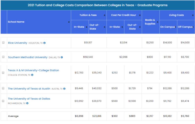 在得克萨斯州的研究生,州外学生平均学杂费为每年$23,018,平均校内住宿费为每年$10,182,平均校外住宿费为每年$9,780。得克萨斯州位于美国的南部,生活成本相对低廉。