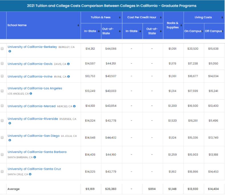 在加州的研究生,州外学生平均学杂费为每年$26,383,校外住宿费平均为每年$14,404。以加州系大学为例,不同学校的学杂费区别不大,但是住宿费与学校所在城市生活水平有关。其中,加州大学伯克利分校的住宿费最高,校内住宿费为每年$20,530,校外住宿费为每年$15,638。