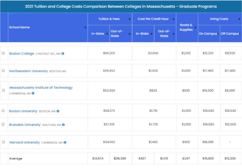 在马萨诸塞州的研究生,州外学生平均学杂费为每年$36,386,平均校内住宿费为每年$15,020,平均校外住宿费为每年$12,330。其中,东北大学和波士顿大学的校内外住宿费基本保持一致,而麻省理工学院的校外住宿费用则外校内住宿的2倍。