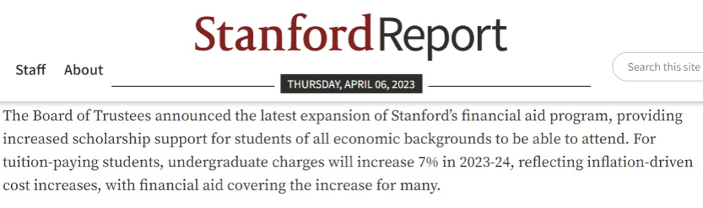 值得注意的是,斯坦福大学2021-22学年本科学费与上一年持平,去年增长4%,而今年却涨得尤其猛,高达7%。算下来,今年入学的本科学生读完四年大约要比去年的学生多花10万余人民币。