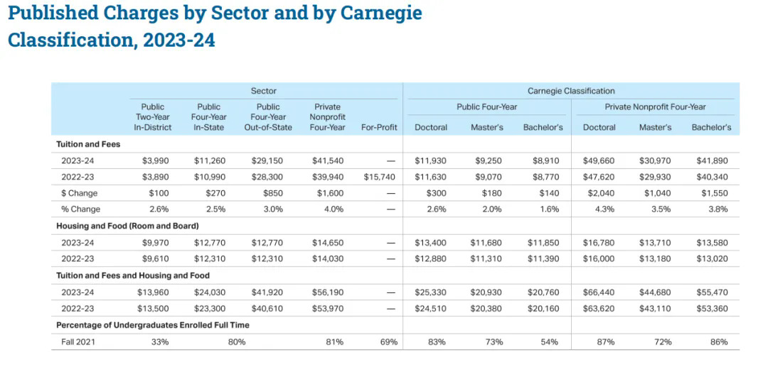 近日,College Board 官方发布了《2023-2024 年美国高等教育学费报告》,报告具体统计了 2023-24 学年美国学费变化情况,并且还统计了学生的食宿、生活费用,为即将踏上留学之路的学生和家长提供了权威的预算指南。