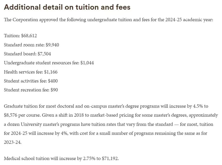 本科生学费上涨3.9%,总费用预计达到87,860美元。同时提供了高达3.11亿美元的本科经济援助预算,相比去年增加了4.5%,为历史最高。