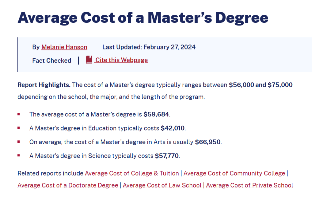 根据Educationdata的统计,硕士学位的费用通常在5.6w-7.5w美元之间,折算成人民币大概是40-54w。