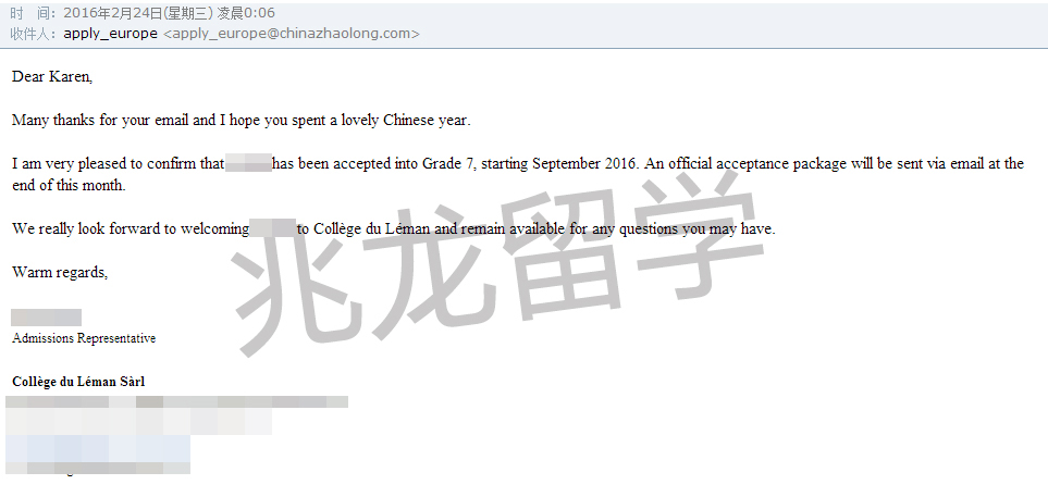 很开心乔同学被瑞士最大、最好的顶尖贵族学校莱蒙学院录取!这也是他们家一致认为最值得去、最想去的瑞士中学!该校位于莱蒙市中心,交通便利,环境优美,学校培养学生的挑战精神,鼓励学生拥有雄心壮志和远大目标,同时培养孩子们音乐/艺术特长,注重体育锻炼,孩子们可以学习多种语言,让孩子们真正地在自由、温暖、安全、温馨的氛围学习生活,赢在起跑线!咨询热线400-666-2249!