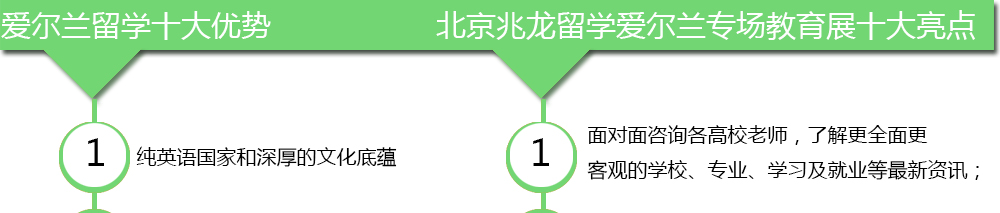 时下,爱尔兰作为欧盟唯一一个纯英语同时使用欧元的国家,以其高质量的教育,纯正的英文环境,相对低廉的留学费用及良好的留学生就业政策受到越来越多关注,爱尔兰大学均排在全球前5%。爱尔兰作为今年教育展的主宾国,为了给广大留学生提供更权威的爱尔兰留学信息,北京兆龙留学爱尔兰专场教育展于2016年10月22日拉开帷幕。届时爱尔兰各大院校负责人将悉数到场,为意向爱尔兰留学的学生提供权威信息。