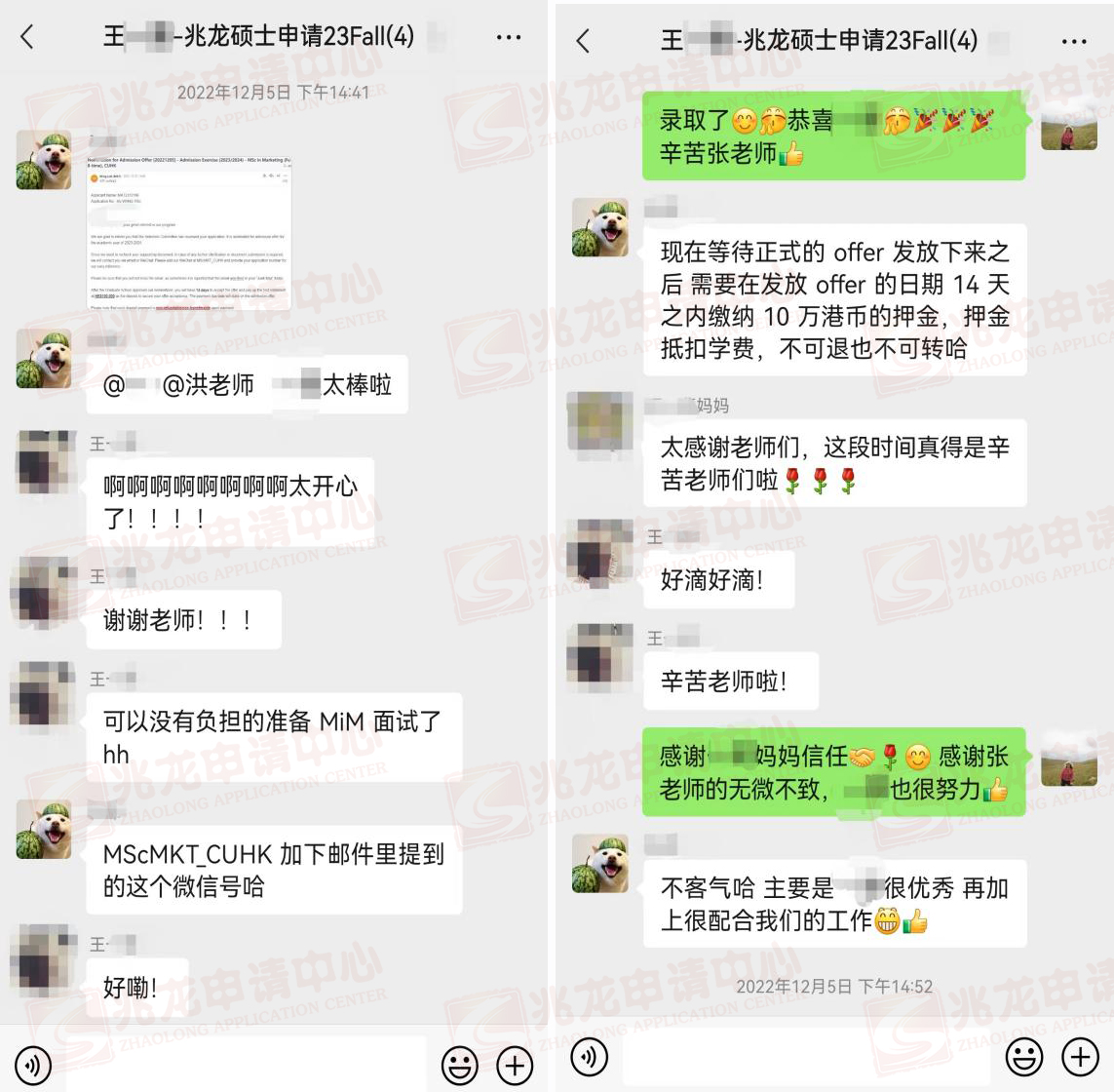 功夫不负有心人,在2022年12月初,王同学就获得了香港中文大学市场营销硕士录取,令人欣喜的是,王同学同时还获得了香港中文大学管理学硕士的面试邀请,最终王同学选择了最理想的MKT专业。