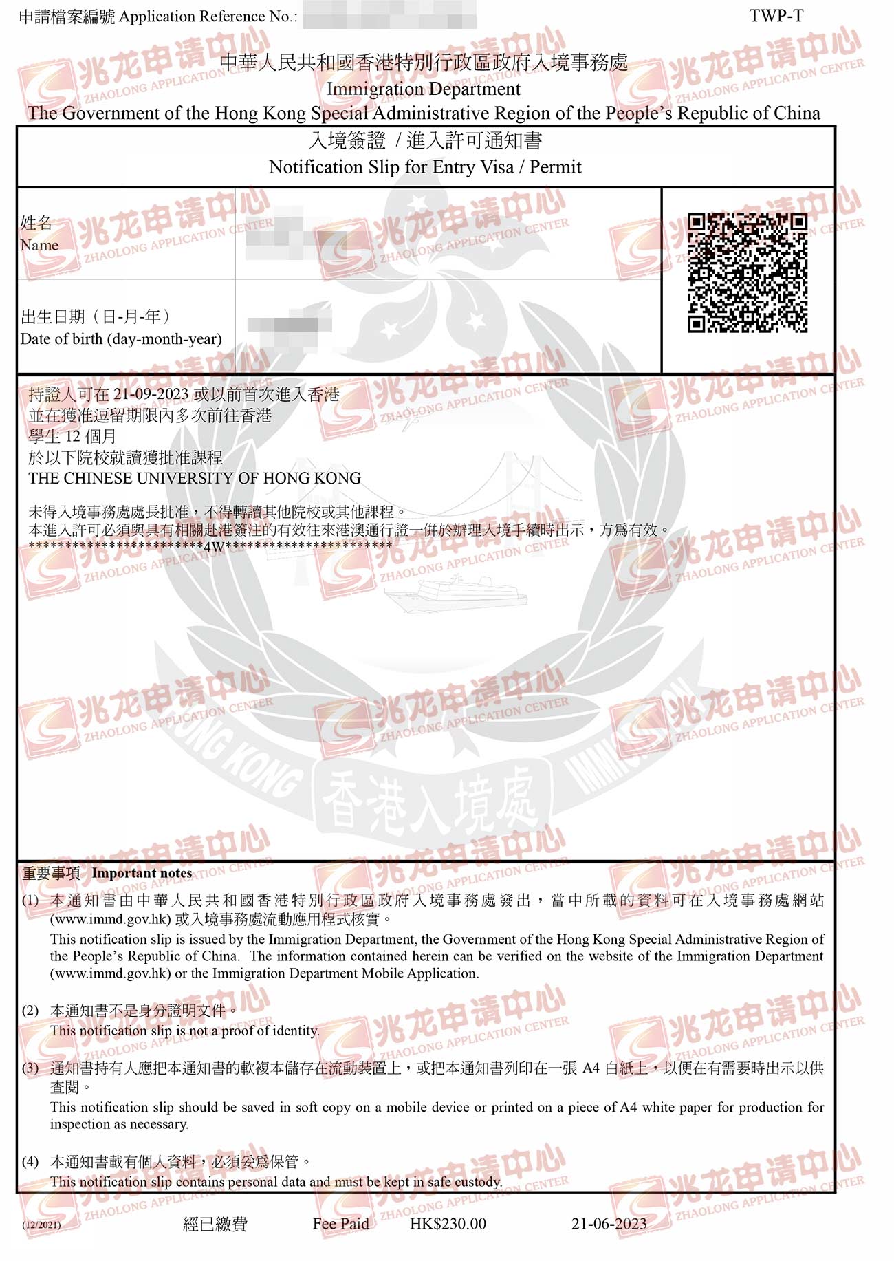 恭喜兆龙留学成功为W同学获得香港中文大学学习签注,在此祝他香港读书之旅一切顺利!更多香港地区大学的申请问题请欢迎拨打兆龙留学咨询热线:010-58702811。