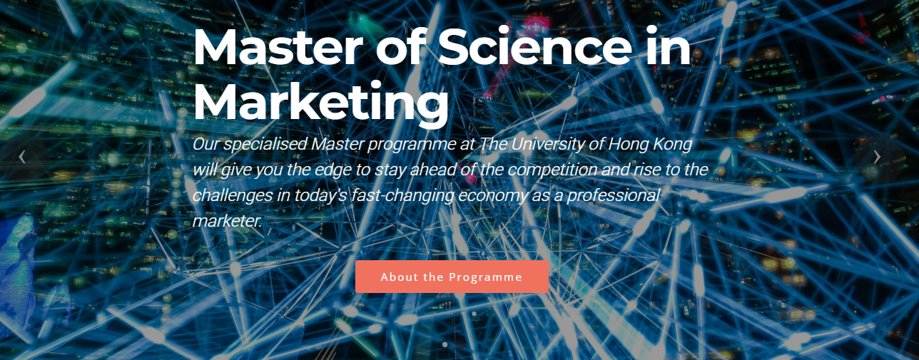 香港大学市场营销硕士学位课程是一年制的全日制项目,通过聚焦于当今快速变化的经济中的最佳营销实践和营销战略,此项目将会为学生提供严格而前沿的学习经历。香港大学市场营销硕士学位课程由三个模块组成,分别是市场营销视野,分析工具和市场营销专业人才决策框架。香港大学市场营销硕士课程学位课程将通过战略导向型的全方位训练来提升学生的分析、交流及思考技能。香港大学市场营销硕士学位课程还会设计公司盈利定位中的伦理和永续性事项。通过香港大学市场营销硕士学位课程的学习,学生将能够在应对千禧一代消费者、新兴市场以及互联网+的市场开发中保持领先。也能在制定营销策略时理解市场趋势、评估消费者视野。将创新和洞察力转换为管理行动来为商业发展助力。