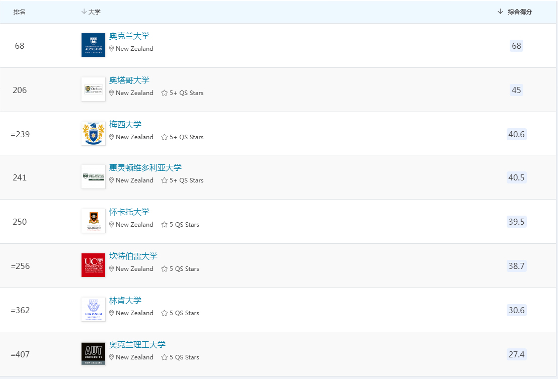 2024QS排名中,新西兰八大均有提升,所有大学均位列世界500强高校中,其中奥克兰大学仍保持新西兰最高排名,位居全球第 68 位,高于去年的第 87 位!是自2010年以来的最高排名。