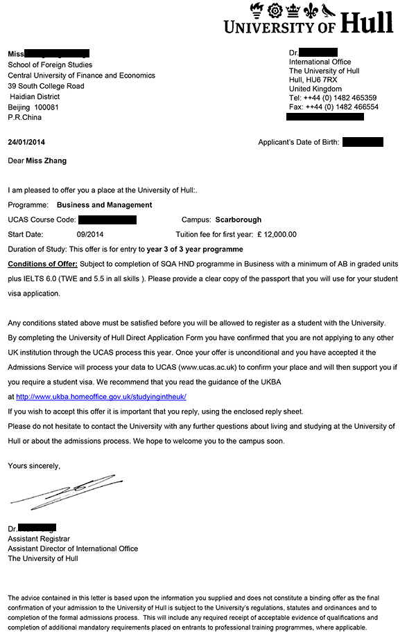 恭喜张同学获得2014年赫尔大学,考文垂大学与朴茨茅斯大学三校OFFER