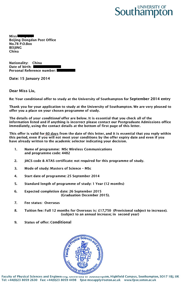 湖南师范大学刘同学获得南安普顿大学OFFER