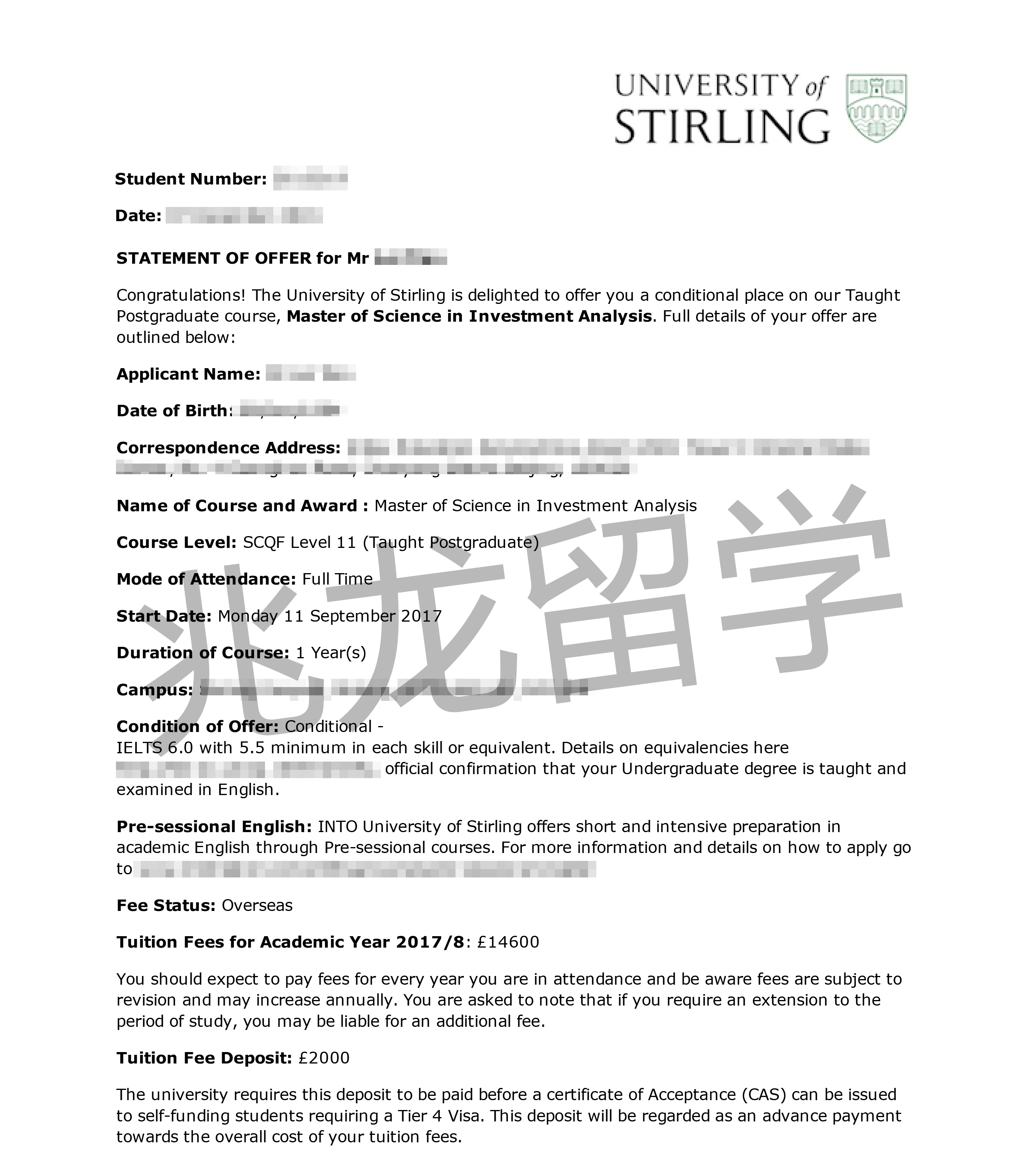 经过兆龙留学网老师的努力,成功为田同学申请到英国斯特灵投资分析专业offer,以下是她的offer分享,在此祝她留学之路一切顺利!