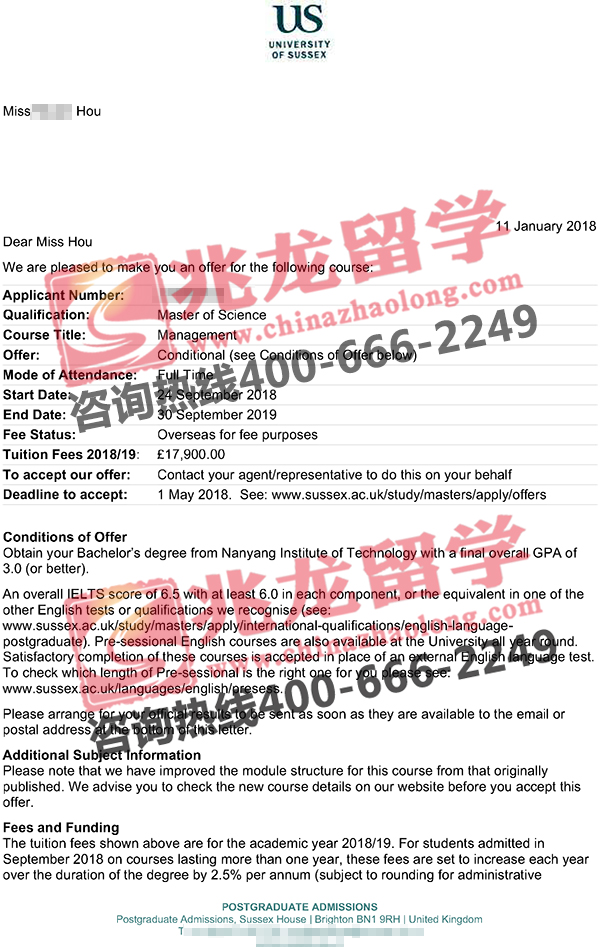 经过兆龙留学英国部老师的努力,成功为侯同学申请到英国苏塞克斯大学管理学专业offer,以下是她的offer分享,在此祝她留学之路一切顺利!更多英国留学申请信息请拨打咨询热线400-666-2249。