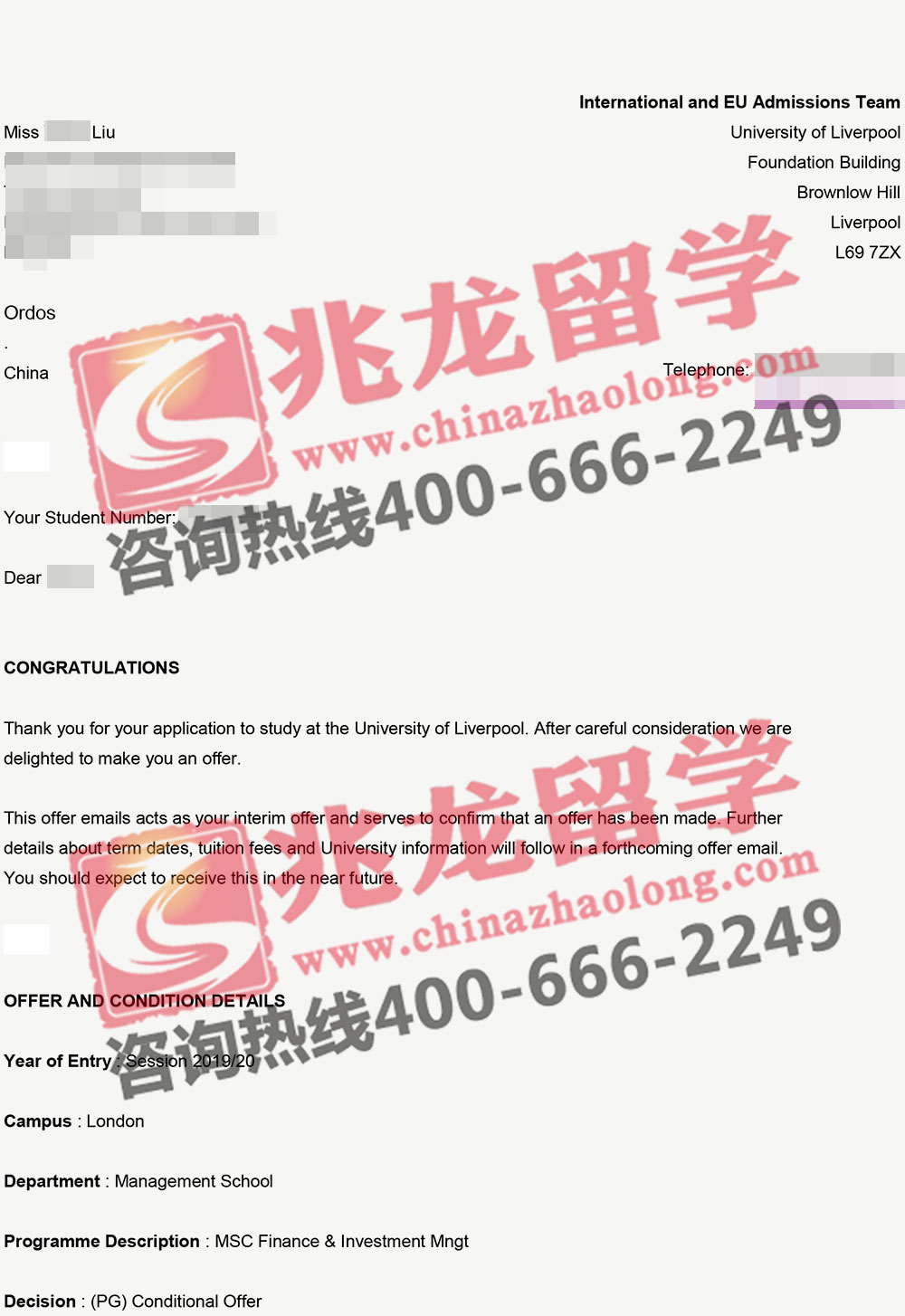 经过兆龙留学欧洲部老师的努力,成功为刘同学申请到英国利物浦大学金融与投资管理硕士offer,以下是学生offer分享,在此祝她留学之路一切顺利!更多英国留学申请信息请拨打咨询热线400-666-2249。