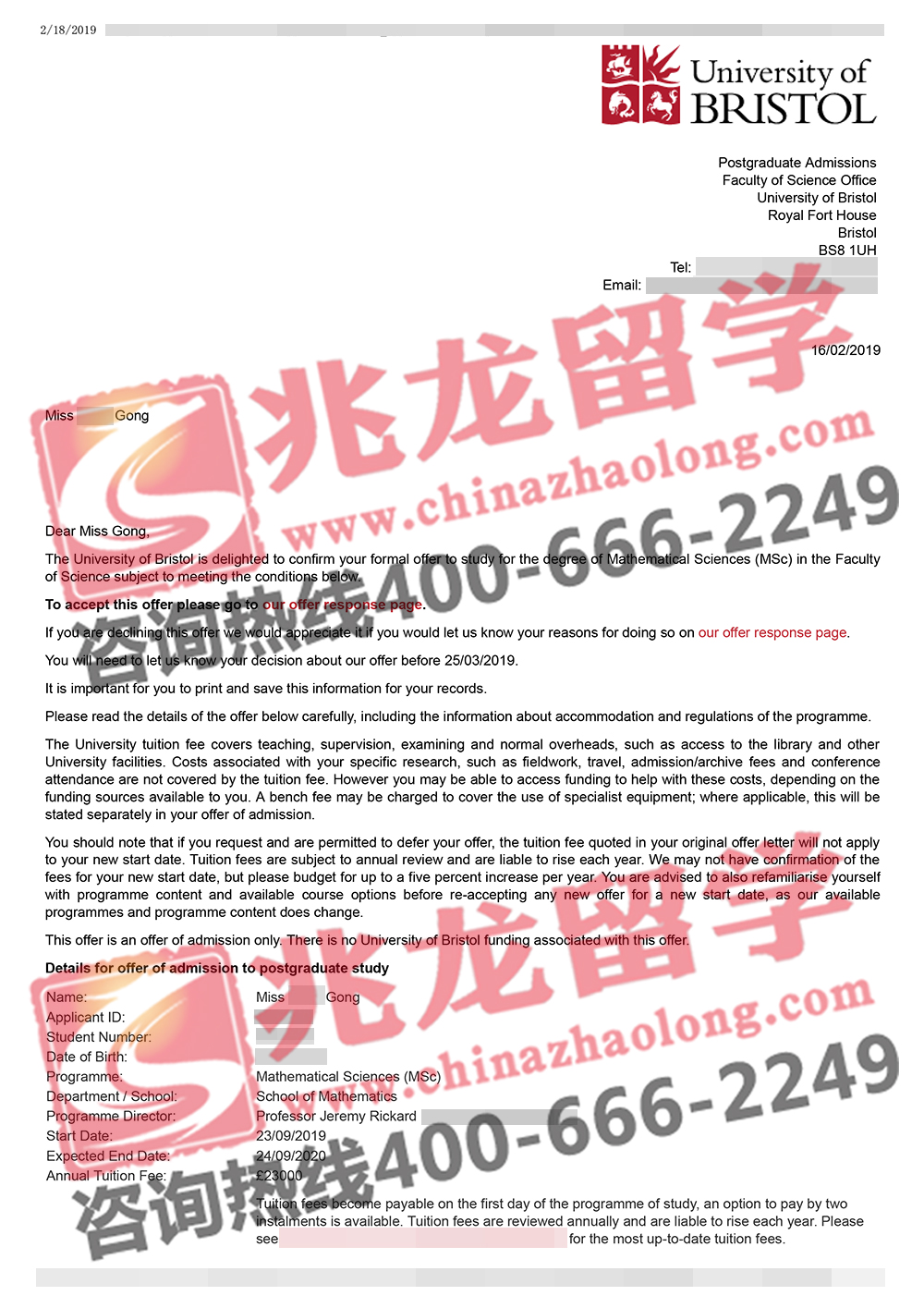 经过兆龙留学英国部老师的努力,成功为宫同学申请到英国布里斯托大学数学科学专业硕士Offer,以下是她的offer分享,在此祝她留学之路一切顺利!更多英国留学申请信息请拨打咨询热线400-666-2249。