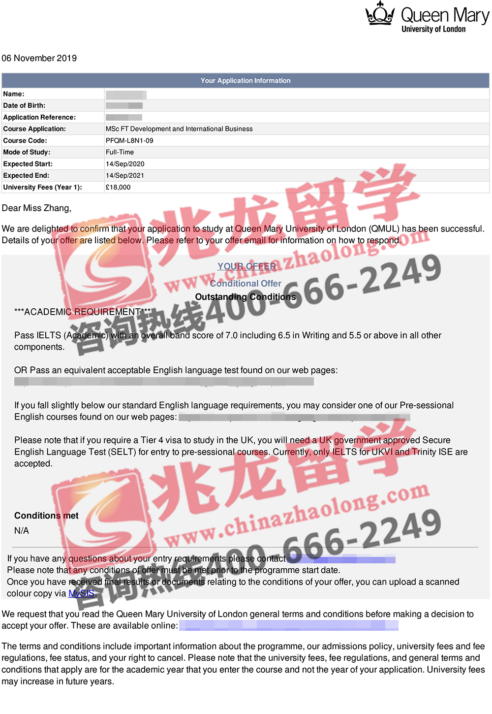 经过兆龙留学英国部老师的努力,成功为张同学申请到英国伦敦大学玛丽皇后学院国际商务与发展专业Offer,以下是他的offer分享,在此祝他留学之路一切顺利!更多英国留学申请信息请拨打咨询热线400-666-2249。