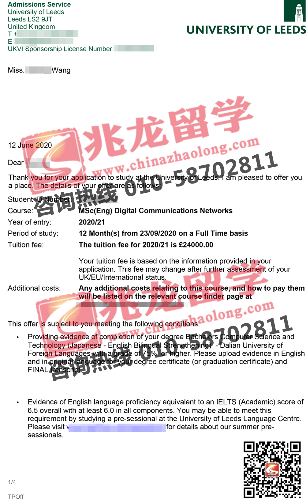 经过兆龙留学英国部老师的努力,成功为王同学申请到英国利兹大学数字通信网络专业硕士Offer,以下是她的offer分享,在此祝她留学之路一切顺利!更多英国留学申请信息请拨打咨询热线010-58702015。