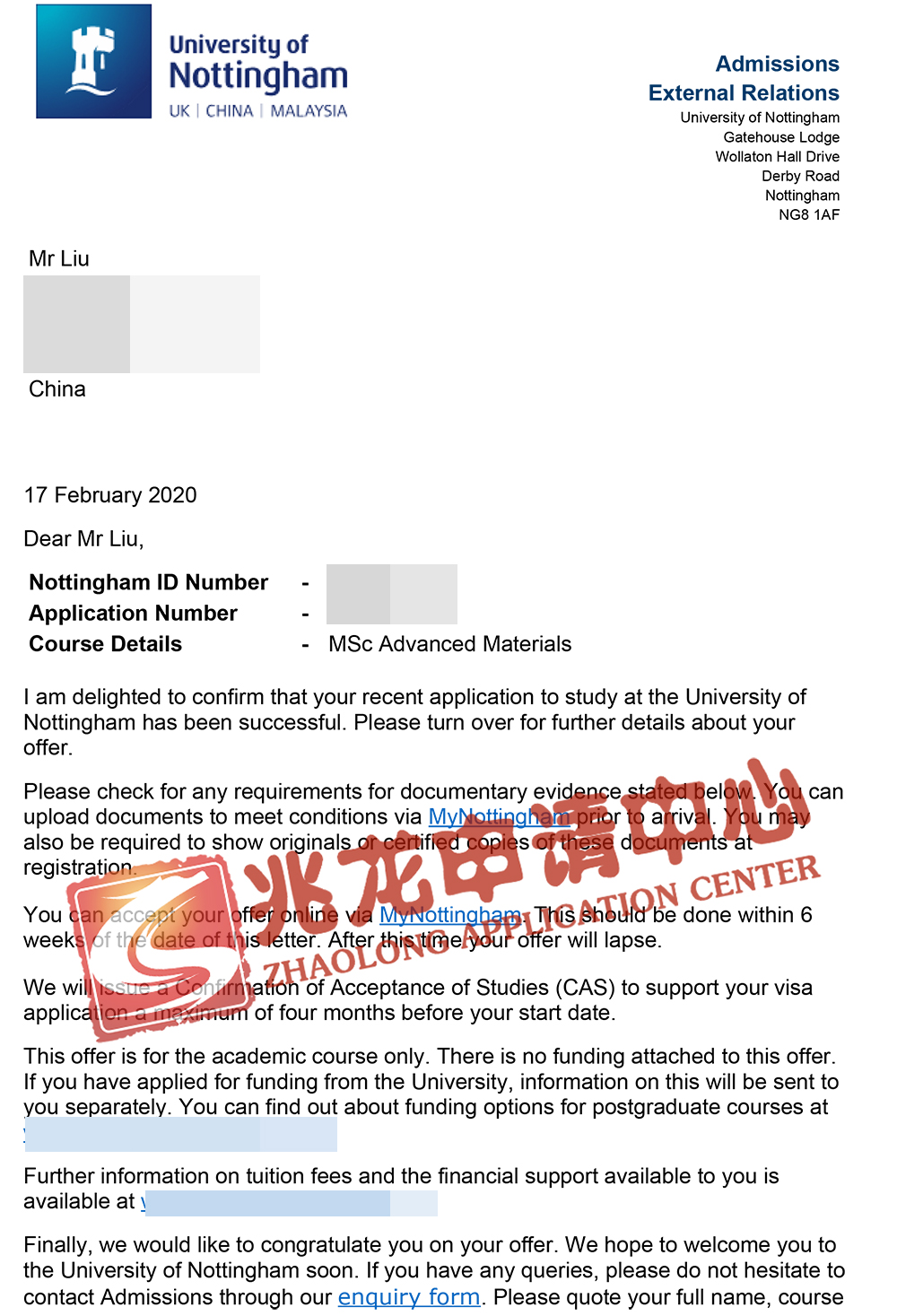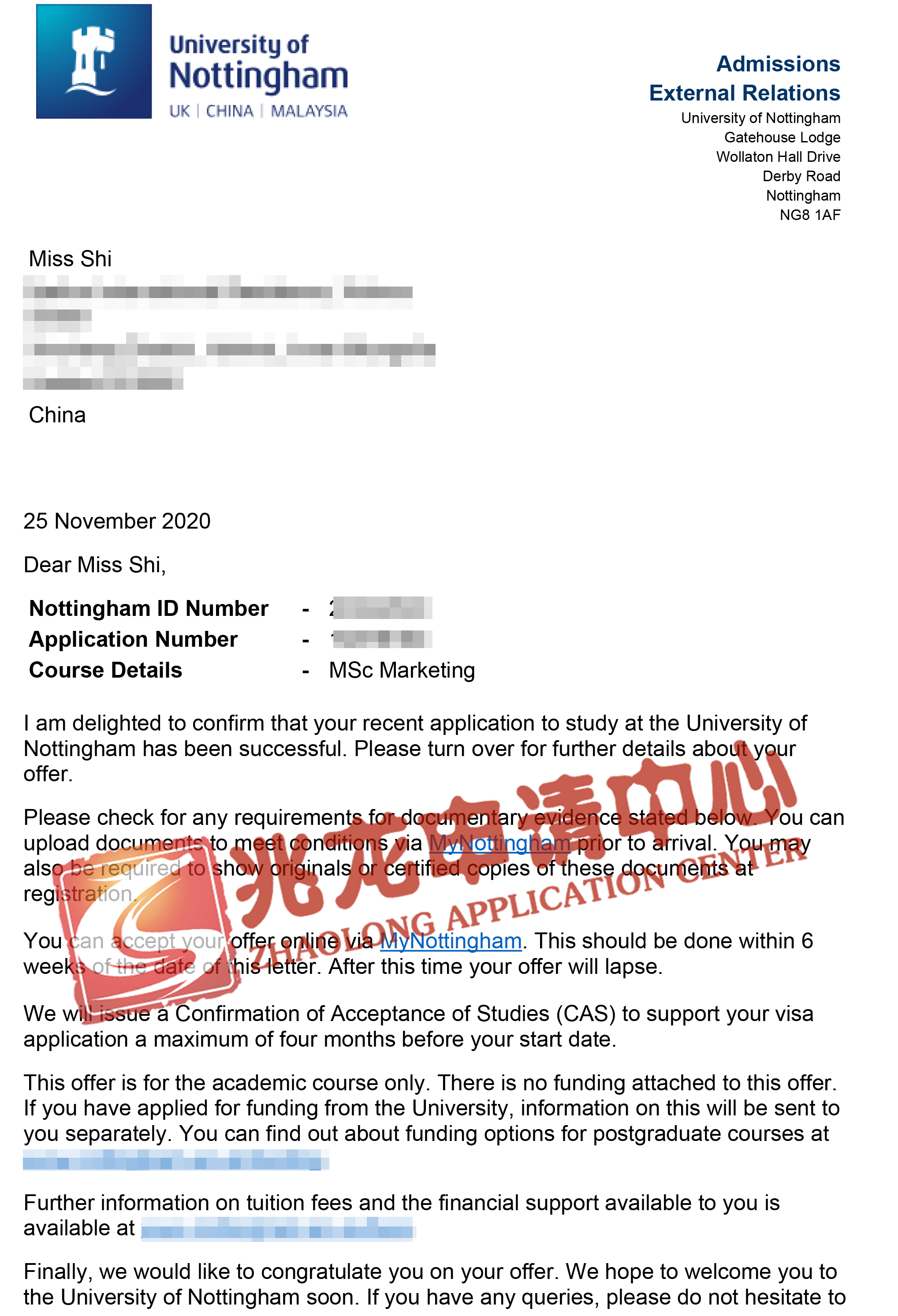 录取院校二:申请院校:University of Nottingham诺丁汉大学