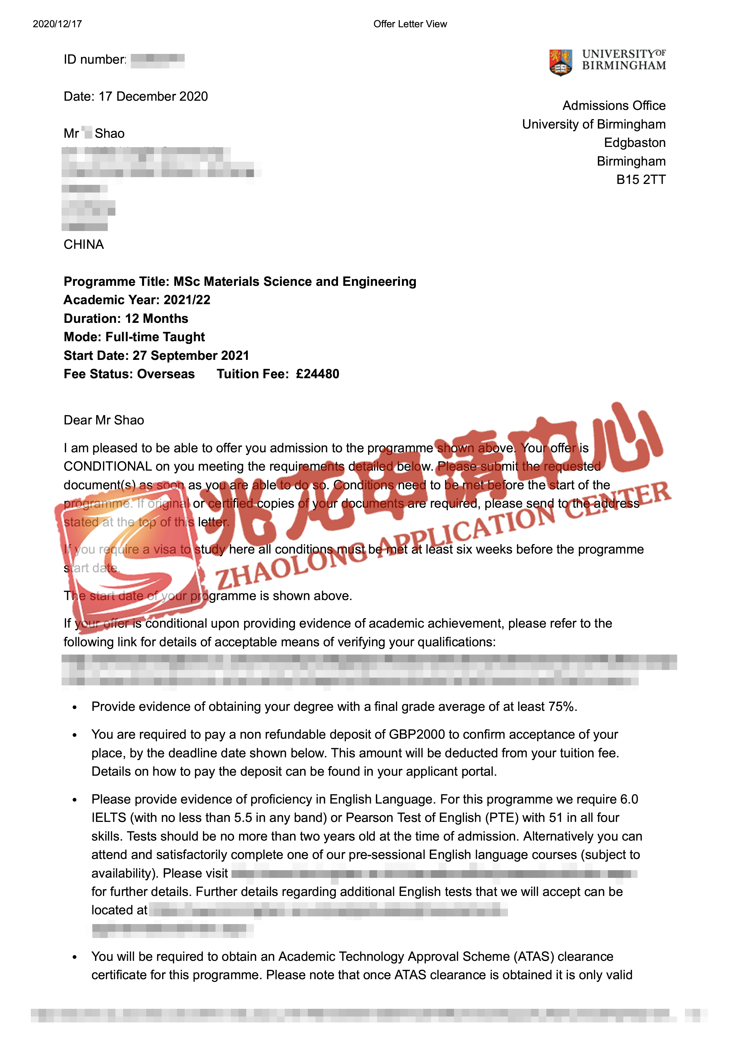 录取院校:University of Sheffield谢菲尔德大学、University of Birmingham伯明翰大学