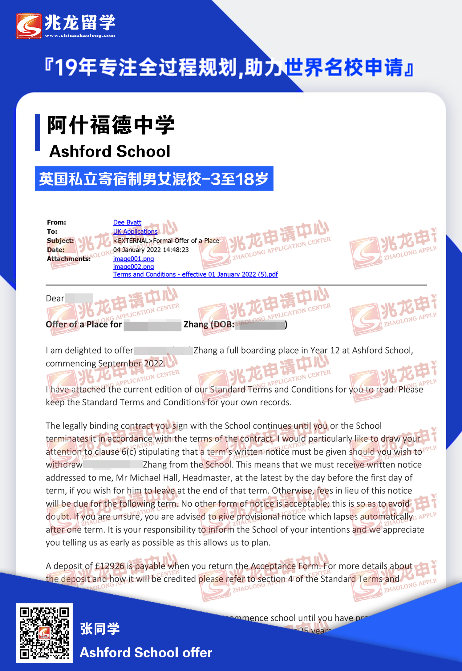 经过兆龙留学英国部老师的努力,成功为张同学申请到英国阿什福德中学Offer,以下是她的offer分享,在此祝她留学之路一切顺利!更多英国留学申请信息请拨打咨询热线010-58702015。