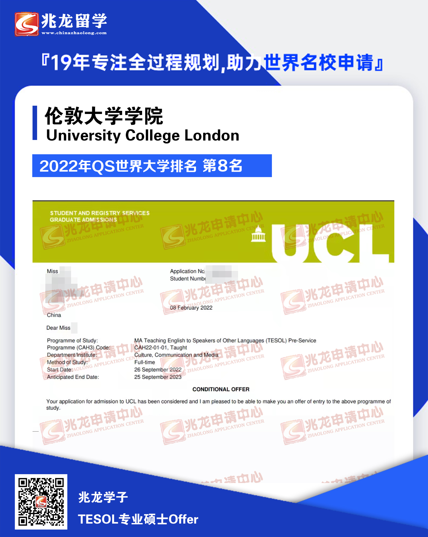 经过兆龙留学英国部老师的努力,成功为兆龙学子申请到英国G5-伦敦大学学院TESOL硕士Offer,以下是她的offer分享,在此祝她留学之路一切顺利!更多英国留学申请信息请拨打咨询热线010-58702015。