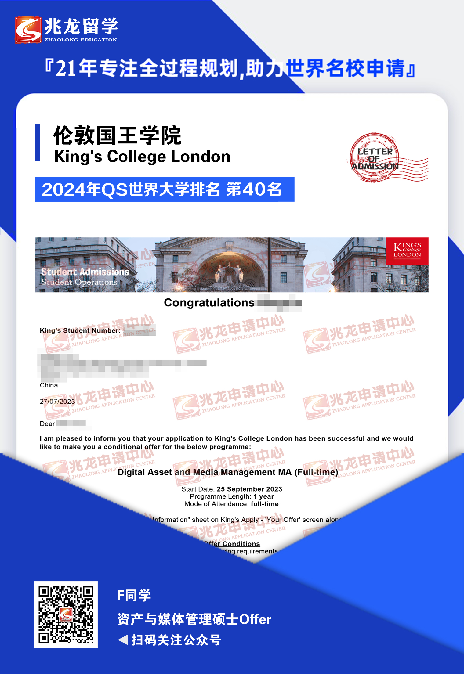 恭喜兆龙留学成功为F同学申请到QS全球排名40的英国伦敦国王学院数字资产与媒体管理专业硕士offer!