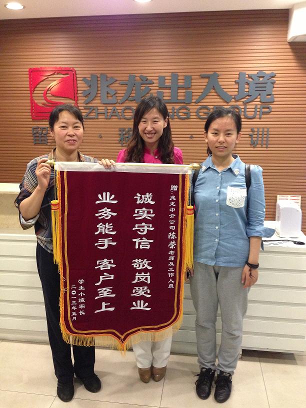 2013年5月22日下午,山西家长专程从山西给兆龙留学送来锦旗,感谢兆龙留学陈老师及其同事为她女儿赴英留学做出的不懈努力。