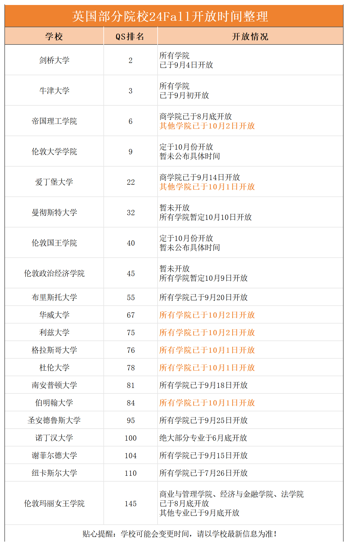 以上就是截至目前为止的部分英国院校开放24年入学申请的信息汇总,对于热门院校热门专业,如果申请人数过多,还有可能会提前终止申请,因此抢占申请先机尤其重要。另外大多数学校今年都提升了录取要求,如果想要知道自己能上什么学校的话可以找我们兆龙留学顾问老师评估哦~