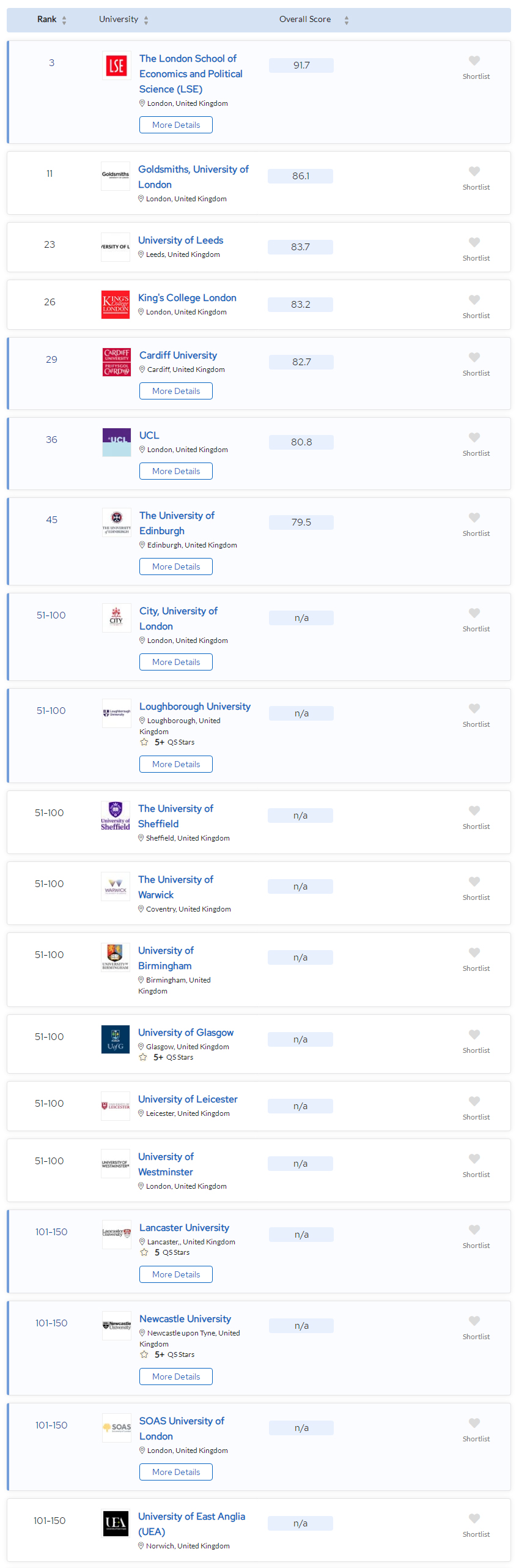 先看一下2023年QS世界大学排名传媒专业的英国大学排名情况。