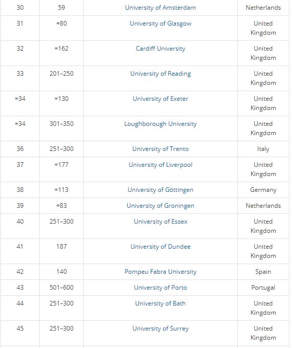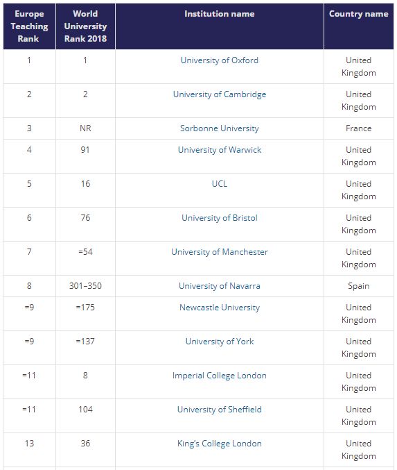 本次排名的前20名中,有16所来自英国。牛津大学仍然问鼎榜首,英国大学的教育优势仍然非常明显。英国地区除了牛津大学之外,剑桥大学、华威大学、伦敦大学学院、布里斯托大学、曼彻斯特大学、纽卡斯尔大学、约克大学、帝国理工学院、谢菲尔德大学、伦敦国王学院、爱丁堡大学、圣安德鲁斯大学、兰卡斯特大学、诺汉丁大学都跻身TOP20。
