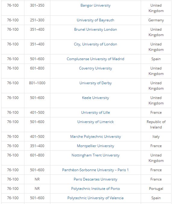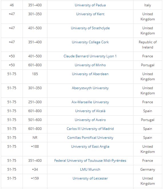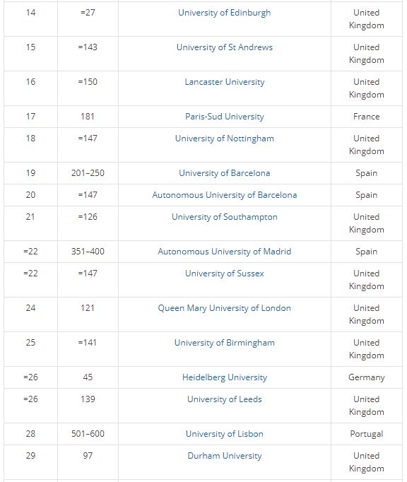 法国地区索邦大学排名第3,巴黎十一大排名17,西班牙地区纳瓦拉大学排名第八,巴塞罗那大学、巴塞罗那自治大学分别是19和20。
