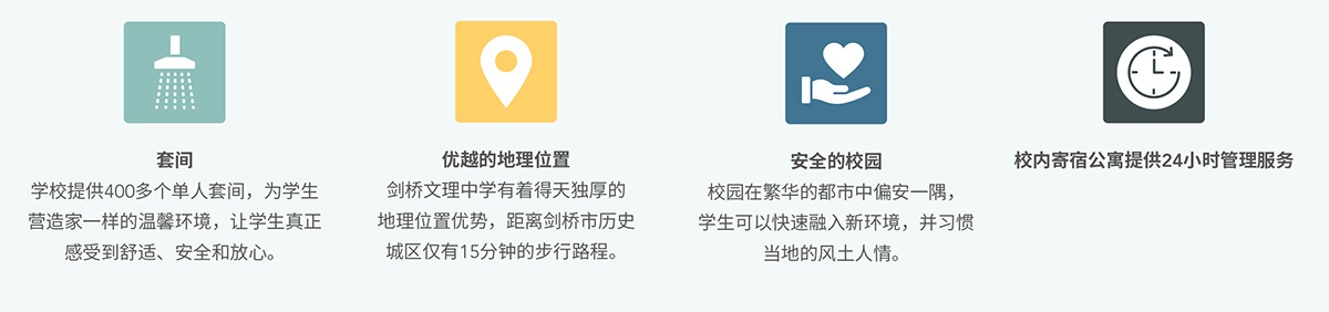 学校为学生发展学术潜力提供全方位的支持,我们精心设计的多功能校园为学生在剑桥的学习和生活营造了优质的学习环境。