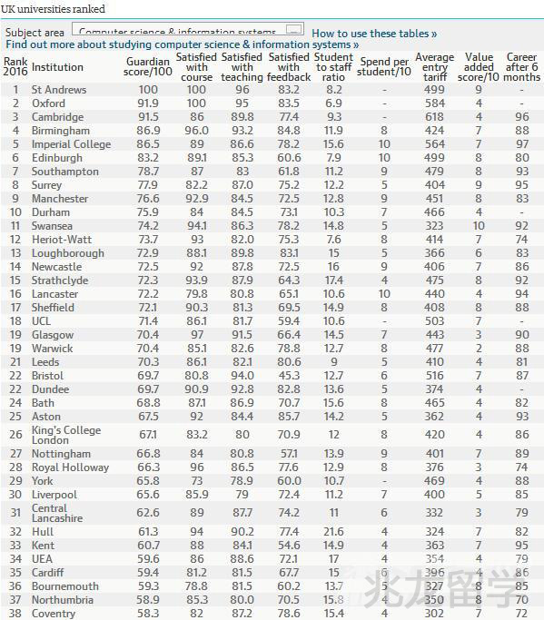 据最新消息得知,2016年英国《卫报》发布了英国大学综合排名,同时,《卫报》更根据各学校的学术等各方面表现进行了专业排名。以下是兆龙留学专家为大家介绍的2016《卫报》英国大学计算机科学与信息系统专业排名可以看出,此次排名位于首位的是圣德安鲁斯大学,第二名牛津大学,第三名为剑桥大学,第四名为伯明翰大学,第五名为帝国理工学院,第六名为爱丁堡大学。