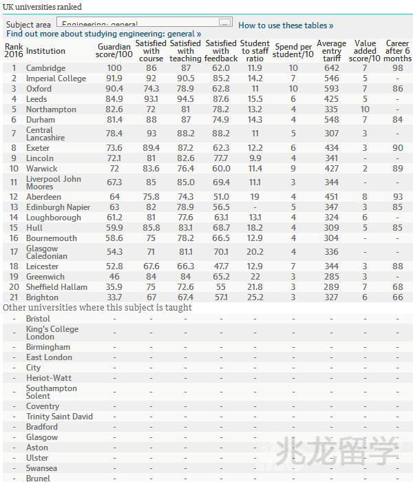 据最新消息得知,2016年英国《卫报》发布了英国大学综合排名,同时,《卫报》更根据各学校的学术等各方面表现进行了专业排名。以下是兆龙留学专家为大家介绍的2016《卫报》英国大学普通工程学专业排名可以看出,此次排名位于首位的是剑桥大学,第二名帝国理工学院,第三名为牛津大学,此后依次为利兹大学、南安普顿大学、杜伦大学。