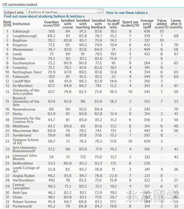据最新消息得知,2016年英国《卫报》发布了英国大学综合排名,同时,《卫报》更根据各学校的学术等各方面表现进行了专业排名。以下是兆龙留学专家为大家介绍的2016《卫报》英国大学时装设计专业排名可以看出,此次排名位于首位的是爱丁堡大学,第二名为拉夫堡大学,第三名为布莱顿大学。