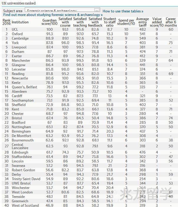 据最新消息得知,2016年英国《卫报》发布了英国大学综合排名,同时,《卫报》更根据各学校的学术等各方面表现进行了专业排名。以下是兆龙留学专家为大家介绍的2016《卫报》英国大学法医科学与考古学专业排名可以看出,此次排名位于首位的是伦敦大学学院,第二名为牛津大学,第三名为剑桥大学,第四名为约克大学。