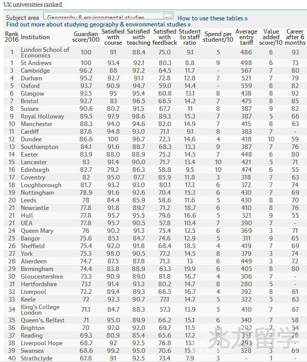 据最新消息得知,2016年英国《卫报》发布了英国大学综合排名,同时,《卫报》更根据各学校的学术等各方面表现进行了专业排名。以下是兆龙留学专家为大家介绍的2016《卫报》英国大学地理及环境研究专业排名可以看出,此次排名位于首位的是伦敦政治经济学院和圣德安鲁斯大学,第三名为剑桥大学,第四名为杜伦大学,第五名为牛津大学。