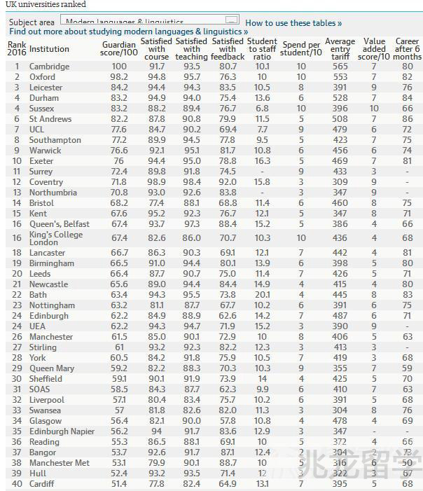 据最新消息得知,2016年英国《卫报》发布了英国大学综合排名,同时,《卫报》更根据各学校的学术等各方面表现进行了专业排名。以下是兆龙留学专家为大家介绍的2016《卫报》英国大学现代语言及语言学专业排名可以看出,此次排名位于首位的是剑桥大学,第二名为牛津大学。