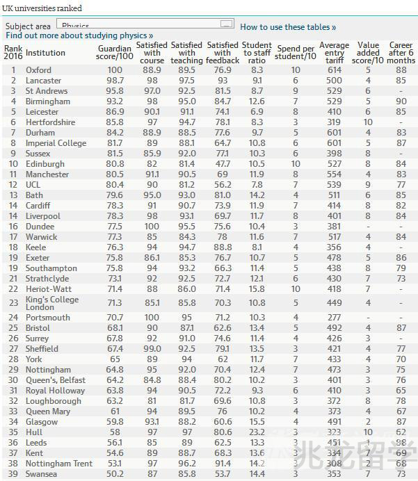 据最新消息得知,2016年英国《卫报》发布了英国大学综合排名,同时,《卫报》更根据各学校的学术等各方面表现进行了专业排名。以下是兆龙留学专家为大家介绍的2016《卫报》英国大学物理学专业排名可以看出,此次排名位于首位的是牛津大学,第二名为兰卡斯特大学,第三名为圣安德鲁斯大学。