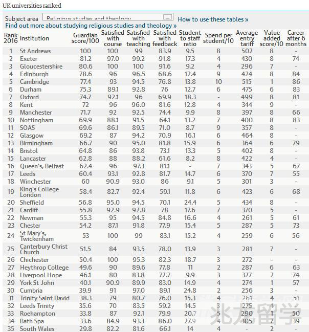 据最新消息得知,2016年英国《卫报》发布了英国大学综合排名,同时,《卫报》更根据各学校的学术等各方面表现进行了专业排名。以下是兆龙留学专家为大家介绍的2016《卫报》英国大学宗教研究与神学专业排名可以看出,此次排名位于首位的是圣安德鲁斯大学,第二名为埃克塞特大学。