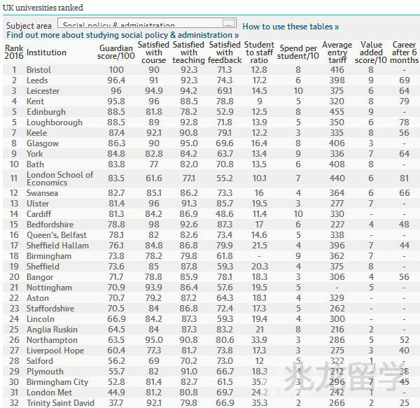 据最新消息得知,2016年英国《卫报》发布了英国大学综合排名,同时,《卫报》更根据各学校的学术等各方面表现进行了专业排名。以下是兆龙留学专家为大家介绍的2016《卫报》英国大学社会政策及行政管理专业排名可以看出,此次排名位于首位的是布里斯托大学,第二名为利兹大学。