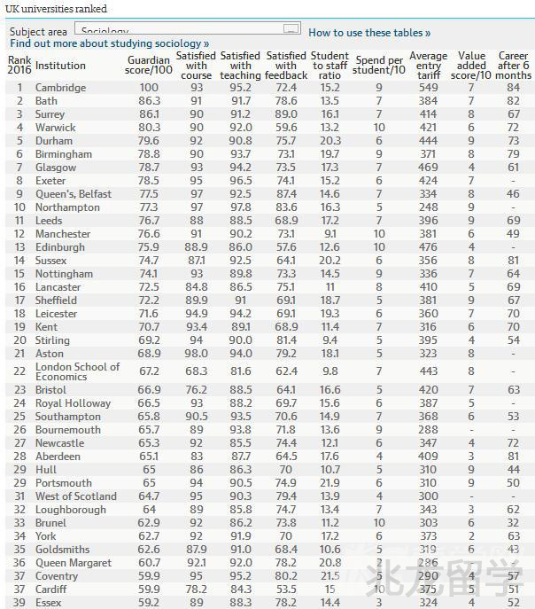 据最新消息得知,2016年英国《卫报》发布了英国大学综合排名,同时,《卫报》更根据各学校的学术等各方面表现进行了专业排名。以下是兆龙留学专家为大家介绍的2016《卫报》英国大学社会学专业排名可以看出,此次排名位于首位的是剑桥大学,第二名为巴斯大学,第三名为萨里大学。