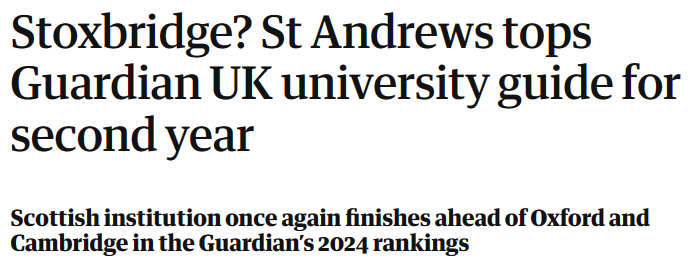 《卫报》再次使用“Stoxbridge”一词来指代圣安、牛津、剑桥三校,卫报认为这可能是英国大学排名的新秩序。在此之前,人们常用 Oxbridge 一词来指代牛剑双雄。