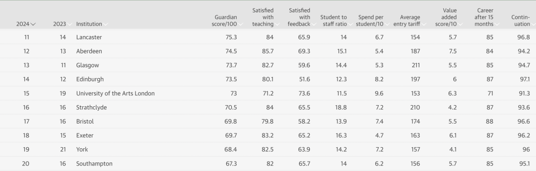 在排名前20的学校中,去年排名上升较明显的阿伯丁大学和伦敦艺术大学依旧保持着上升的趋势,分别上升了一个名次和4个名次,位列第12名和第15名。